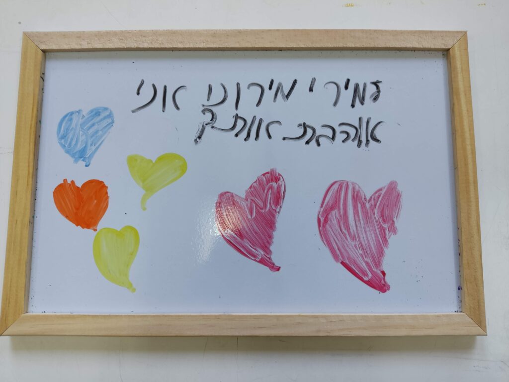 "למירי, אני אוהבת אותך היה לי ממש כיף להיות ואת עזרת לי ממש לקרוא וזה היה ממש כיף לשחק איתך"
